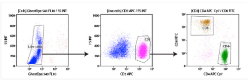 人外周血單核細(xì)胞 (PBMC) 可以使用免疫表型分析分為各種細(xì)胞類型。在此實(shí)驗(yàn)中,使用靶向細(xì)胞表面的 CD3、CD4 和 CD8 蛋白的抗體檢測(cè) T 細(xì)胞并進(jìn)一步細(xì)分為 2 種主要亞群。CD3 是一種在所有 T 細(xì)胞中均表達(dá)的蛋白,它將 T 細(xì)胞與其他白細(xì)胞(中間、粉色細(xì)胞群)區(qū)分。一旦選擇了 T 細(xì)胞,CD4+ 和 CD8+ 細(xì)胞群就很容易區(qū)分。該實(shí)驗(yàn)還使用了一種死活細(xì)胞鑒定染料,以便從分析中排除死細(xì)胞 .