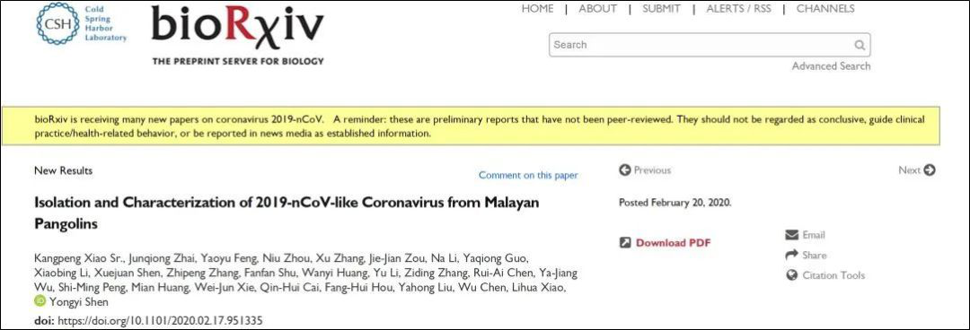 2 月 20 日,bioRxiv 平臺發(fā)布了華南農(nóng)業(yè)大學沈永義教授、肖立華教授團隊通過對穿山甲樣品進行宏基因組分析,該團隊發(fā)現(xiàn)穿山甲為新型冠狀病毒潛在中間宿主。