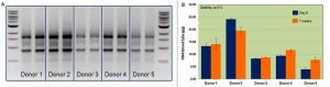 圖6.使用RNAgard血液系統(tǒng)在4℃下相對(duì)于對(duì)照(Day = 0)儲(chǔ)存7周后測試來自5個(gè)不同供體的全血的RNA產(chǎn)量。數(shù)據(jù)顯示,在4℃下在RNAgard血管中儲(chǔ)存7周后RNA的質(zhì)量和產(chǎn)量等于在抽血當(dāng)天從全血中純化的RNA的質(zhì)量和產(chǎn)量。