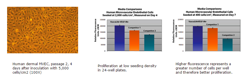VascuLife?VEGF-MV培養(yǎng)基生長(zhǎng)人皮膚微血管內(nèi)皮細(xì)胞和其他人微血管內(nèi)皮細(xì)胞,其生長(zhǎng)速率達(dá)到或超過(guò)其他商用含血清培養(yǎng)基,同時(shí)保持良好的細(xì)胞形態(tài)。