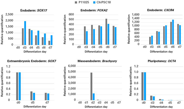 兩種hiPS細胞系(ChiPSC18和P11025)使用Cellartis最終內胚層分化試劑盒與DEF-CS培養(yǎng)基生成最終內胚層細胞的mRNA表達譜。