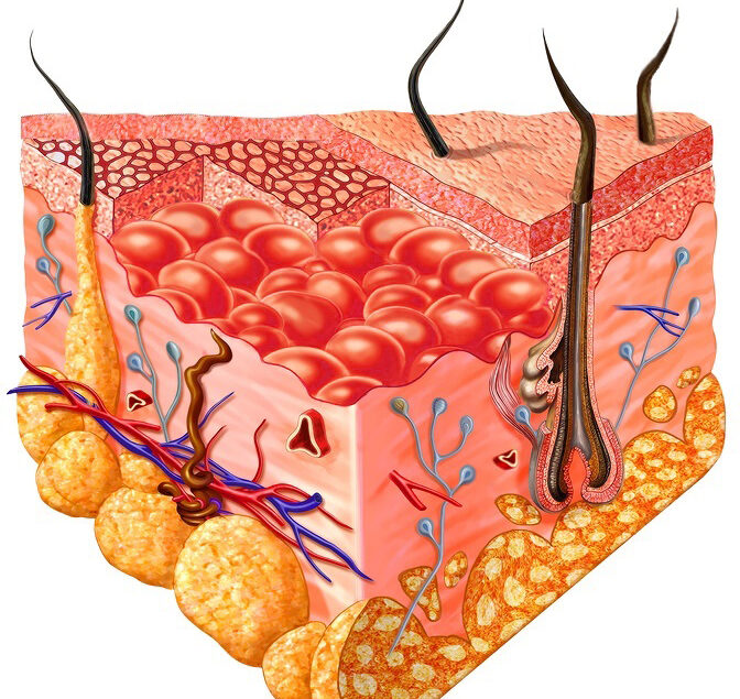Human skin cutaway diagram with several details. 2D digital illustration with clipping path on white background.
