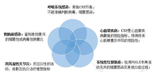 C-反應(yīng)蛋白(C-reactive protein,CRP)是一種在血漿中發(fā)現(xiàn)的肝源性急性蛋白,結(jié)構(gòu)為環(huán)狀五聚體。肝臟對(duì)巨噬細(xì)胞和脂肪細(xì)胞釋放的因子產(chǎn)生應(yīng)答后可合成CRP,其生理作用是與死細(xì)胞或?yàn)l死細(xì)胞(和某些類型的細(xì)菌)表面的溶血磷脂膽堿結(jié)合,以通過(guò) C1q 復(fù)合物來(lái)激活補(bǔ)體系統(tǒng)。它與C-肽 (胰島素)或蛋白C (血凝)不相關(guān)。CRP 通常作為炎癥標(biāo)志物,當(dāng)機(jī)體受到炎癥感染時(shí),CRP 水平會(huì)急劇上升。