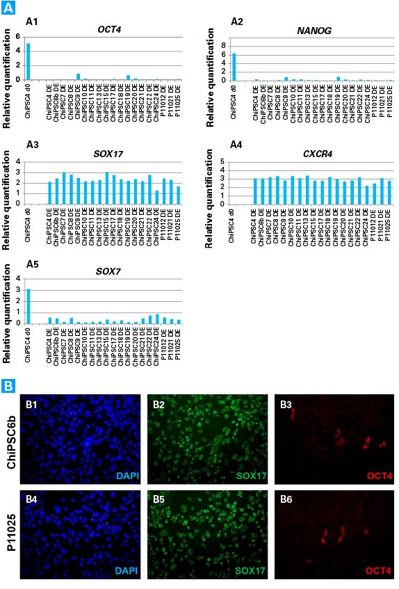 從hiPS細(xì)胞系中衍生同質(zhì)終代內(nèi)胚層細(xì)胞。A. RT-qPCR分析顯示,DE細(xì)胞中干細(xì)胞標(biāo)志物OCT4 (A1)和NANOG (A2)的表達(dá)下調(diào)。與未分化的hiPS細(xì)胞相比,DE細(xì)胞中DE標(biāo)記物CXCR4 (A3)和SOX17 (A4)的mRNA表達(dá)強(qiáng)烈上調(diào)。胚胎外標(biāo)記物SOX7 (A5)的低表達(dá)表明胚胎外內(nèi)胚層細(xì)胞極少發(fā)生。b組DE標(biāo)記物SOX17 (B2, B5)和干細(xì)胞標(biāo)記物OCT4 (B3, B6)的免疫細(xì)胞化學(xué)染色顯示,來(lái)自hiPS細(xì)胞系ChiPSC6b和P11025的DE細(xì)胞中存在少量OCT4免疫陽(yáng)性細(xì)胞核,而大多數(shù)SOX17免疫陽(yáng)性細(xì)胞核。細(xì)胞核用DAPI染色(B1, B4)。