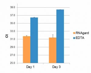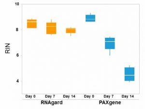 圖4.使用RNAgard血液系統(tǒng)獲得的RNA純度具有高度可重復(fù)性。從8名健康供體收集血液。在樣品儲(chǔ)存3,7或15天后,從一式兩份樣品中純化RNA。通過UV分光光度法(A260 / A280)測定每個(gè)單獨(dú)樣品的RNA純度。在第3天,通過3個(gè)不同的操作員純化每個(gè)供體的重復(fù)樣品,顯示我們系統(tǒng)的可重復(fù)性。