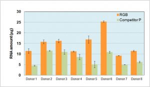 圖3.環(huán)境溫度儲(chǔ)存14天后RNAgard血管(RGB)與競爭對(duì)手P(P)的多個(gè)供體比較。在1.2%瓊脂糖凝膠上觀察200ng RNA。BioMaxi血液RNA純化試劑盒用于從RNAgard血液管中分離RNA。