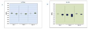 圖5. RNAgard血管在18-25°C保持14天不變的基因表達(dá)。將來自兩個(gè)健康供體的血液收集在RNAgard管中,并在指定的儲(chǔ)存時(shí)間后用BioMaxi RNA純化。相對(duì)于第0天樣品,通過qPCR在指定的儲(chǔ)存時(shí)間測定歸一化為18S rRNA的C-Fos(A)和IL1-β(B)的基因表達(dá)。