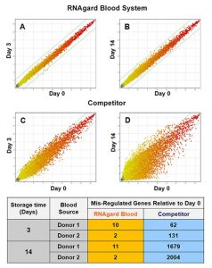 圖1.在RNAgard血液(RGB)中3和14天后血液RNA保存的基因表達(dá)分析。來自2個(gè)健康供體的人血收集在RNAgard管或競爭者的RNA保存管中。在收集日和室溫儲(chǔ)存3或14天后分離RNA。上圖:使用Ilumina Human HT12 Bead Array對(duì)于供體2的基因表達(dá)譜的代表性分析,用于在3天(A,C)或14天后從RNAgard血液或競爭者管中收集的血液中提取的RNA (B,D)室溫儲(chǔ)存,相對(duì)于從新采集的血液中提取的RNA,使用推薦用于每種產(chǎn)品的RNA分離方法。下圖:表格總結(jié)了微陣列結(jié)果。顯示的是具有>的基因數(shù)量