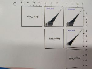 C:不同建庫起始量相關(guān)性高。分別使用1ug、500ng、100ng起始量進行建庫測序,不同起始量的結(jié)果皮爾遜相關(guān)系數(shù)R2均超過0.978