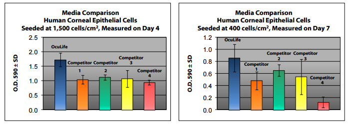 OcuLifeTM 培養(yǎng)基生長人角膜上皮細(xì)胞,在至少三次傳代期內(nèi)具有很好的形態(tài)。與其他商業(yè)媒體相比,OcuLifeTM在不同的播種密度下表現(xiàn)出較好的增殖能力。