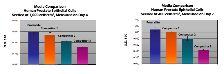 ProstaLife?培養(yǎng)基通過至少15次人口倍增培養(yǎng)人類生殖上皮細(xì)胞,在保持良好細(xì)胞形態(tài)的同時滿足或超過其他商業(yè)培養(yǎng)基。與其他商業(yè)化培養(yǎng)基相比,ProstaLife?在不同的接種密度下表現(xiàn)出更好的增殖能力。