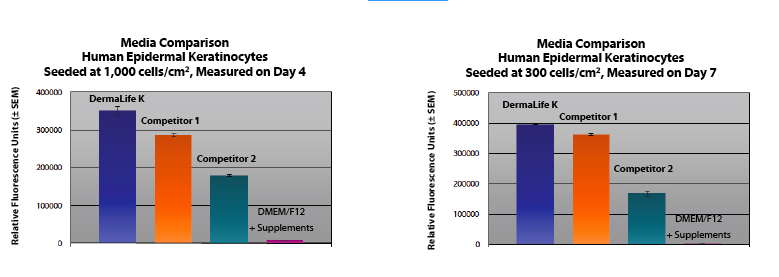 DermaLife K無血清培養(yǎng)基培養(yǎng)原代人表皮角質(zhì)形成細(xì)胞和原代口腔角質(zhì)形成細(xì)胞至少15倍,其速度達到或超過其他市售無血清培養(yǎng)基,同時保持良好的細(xì)胞形態(tài)。與其他市售培養(yǎng)基相比,DermaLife K在不同的播種密度下表現(xiàn)出更強的初代表皮角質(zhì)形成細(xì)胞增殖能力。